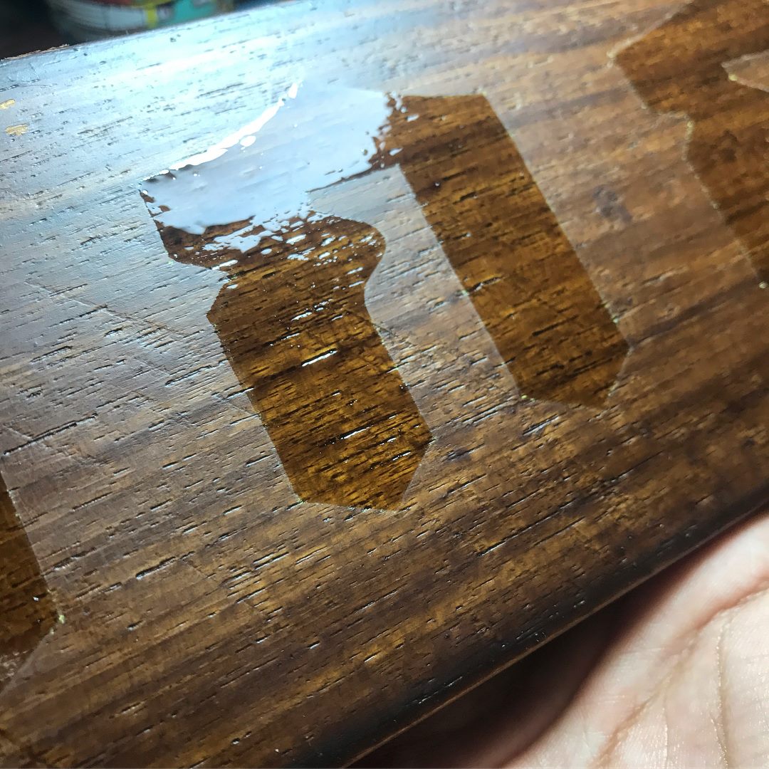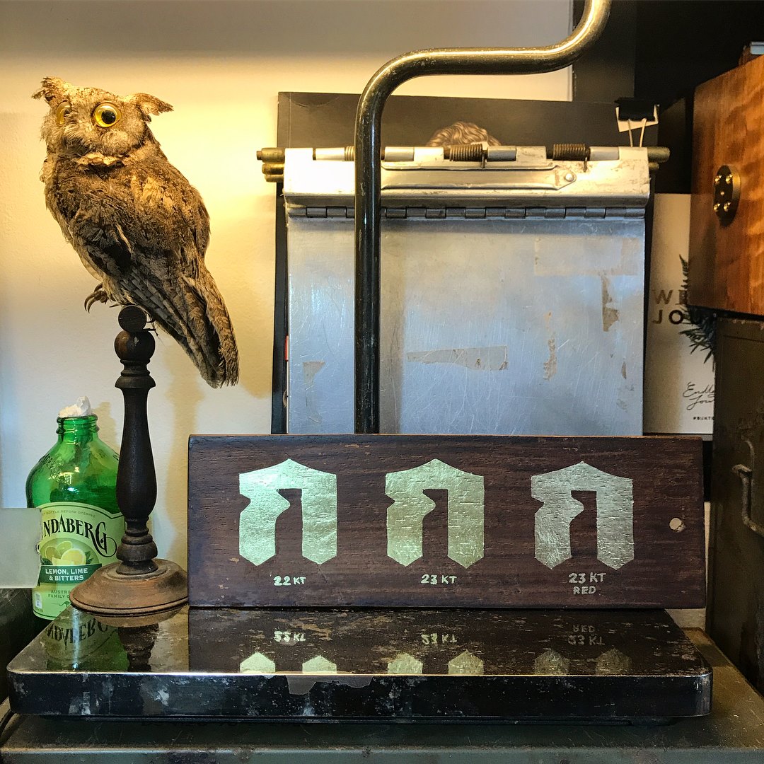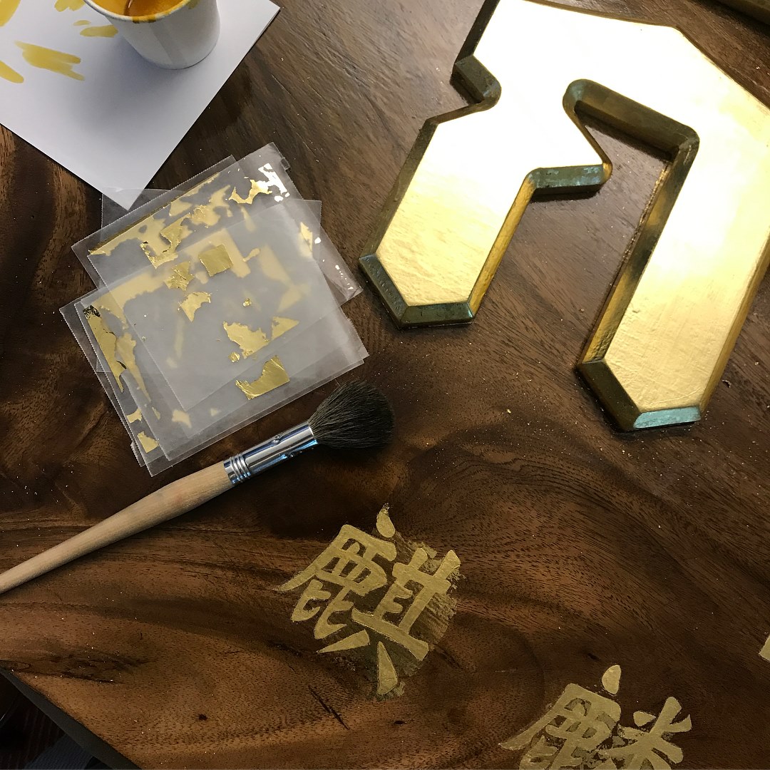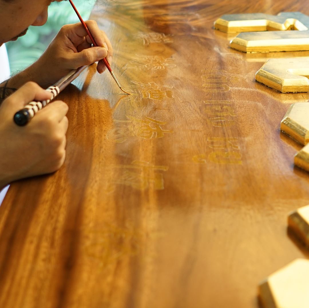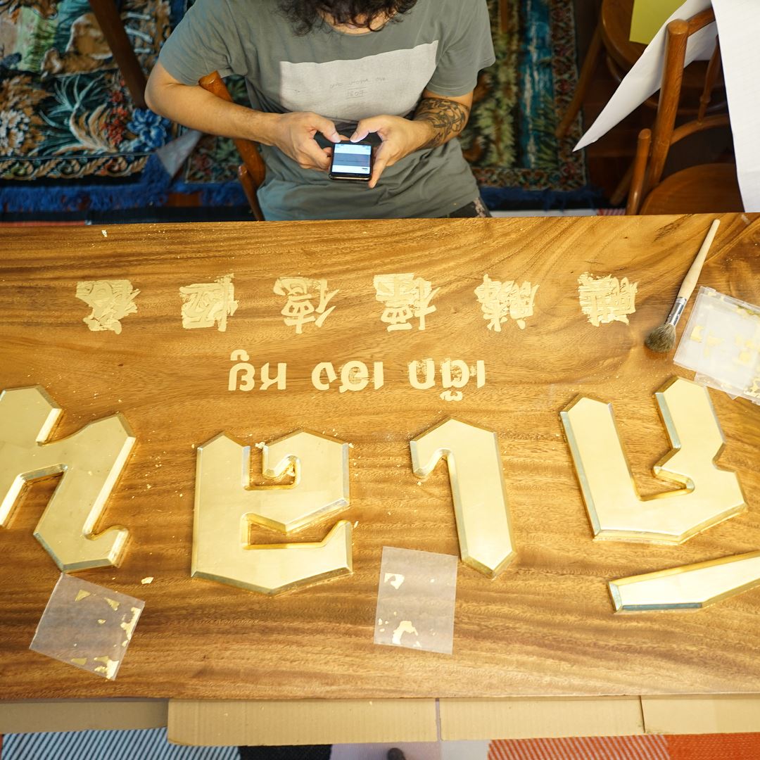 Gilding a main entrance sign with 23kt gold surface gilded on teak wood.